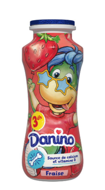 Lait écrémé, crème, poudre de lait écrémé, Sucre, Sirop aromatisé (Fraise), Citrate de tr-calcium, Chlorure de calcium, ferments lactiques, Colorants (rouge carmin), Vitamine D.